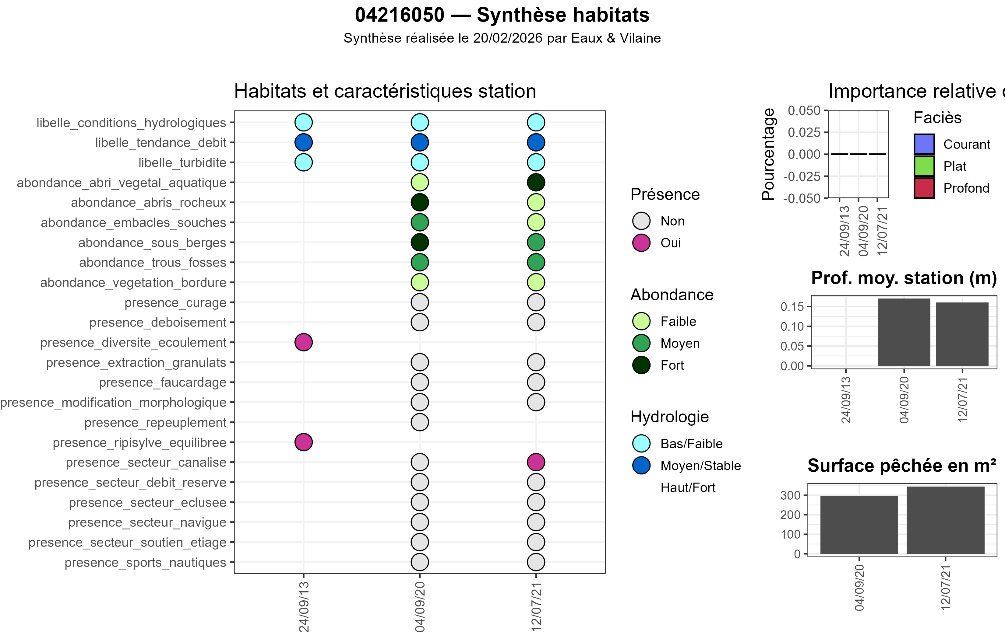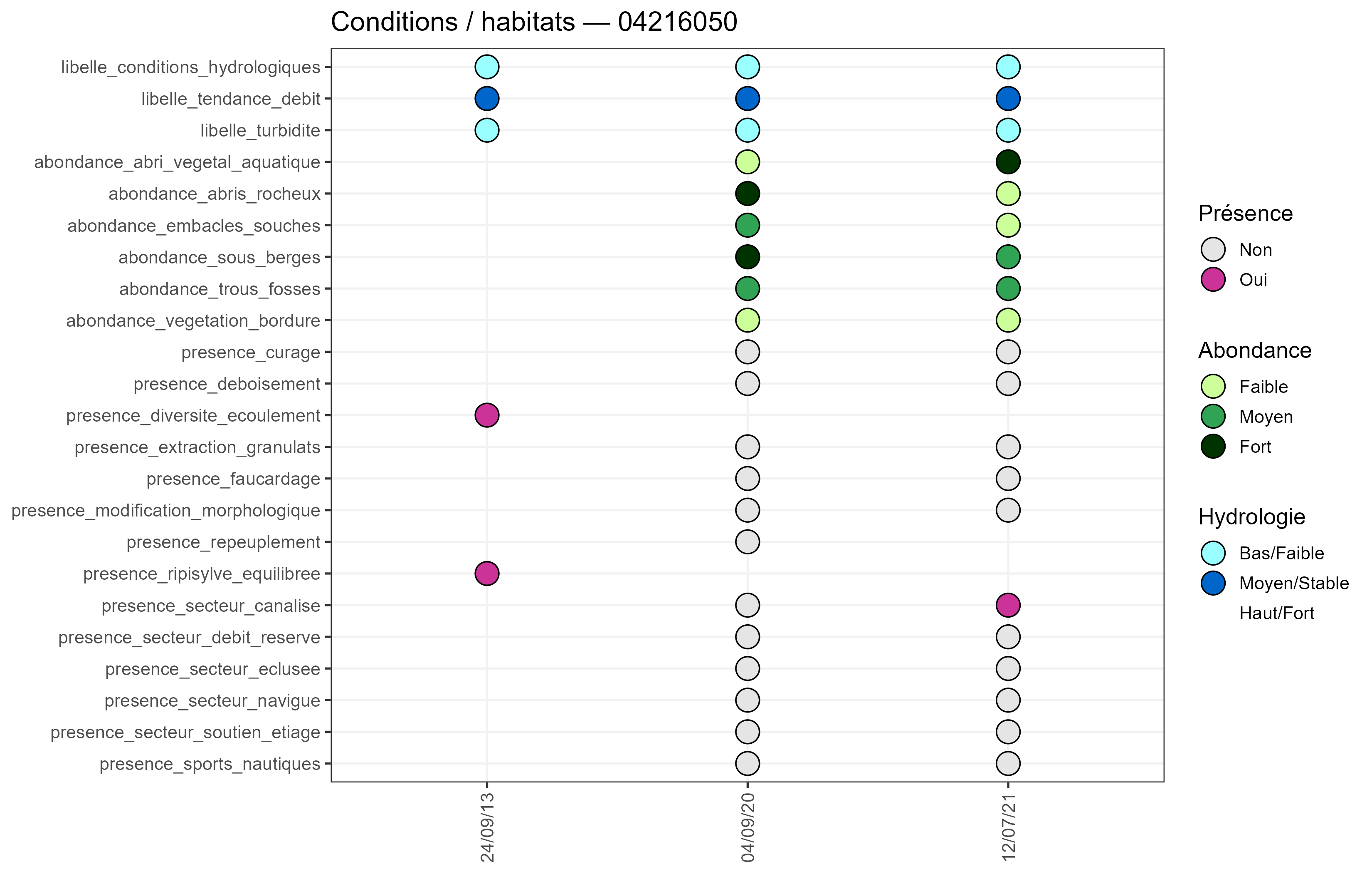 → hydrologie (libelle_conditions_hydrologiques, etc.)